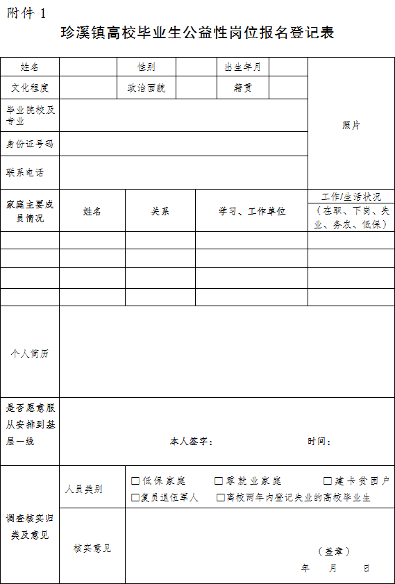 3.报名材料:户口本、身份证、毕业证(需提供学信网学历验证)、学位证原件及复印件1份、《珍溪镇高校毕业生公益性岗位报名登记表》(附件1)、1寸彩色登记照1张。