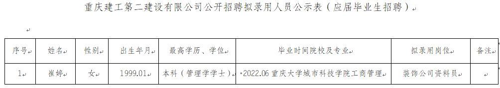 附件:重庆建工第二建设有限公司2022年公开招聘拟录用人员公示表