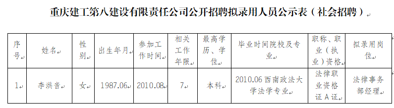 按照重庆建工集团员工招聘管理办法相关规定,根据重庆建工第八建设有限责任公司招聘启事,经公开招聘,现将拟录用人员予以公示。