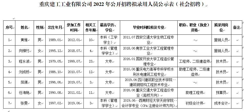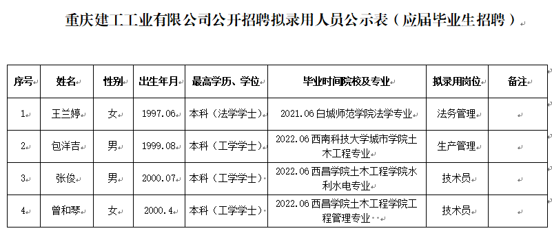 按照重庆建工集团员工招聘管理办法相关规定,根据重庆建工工业有限公司2022年公开招聘相关招聘启事,经公开招聘,现将拟录用人员予以公示。