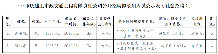 按照重庆建工集团员工招聘管理办法相关规定,根据重庆建工市政交通工程有限责任公司相关招聘启事,经公开招聘,现将拟录用人员予以公示。