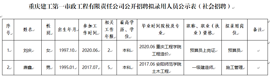 按照重庆建工集团员工招聘管理办法相关规定,根据重庆建工第一市政工程有限责任公司招聘启事,经公开招聘,现将拟录用人员予以公示。