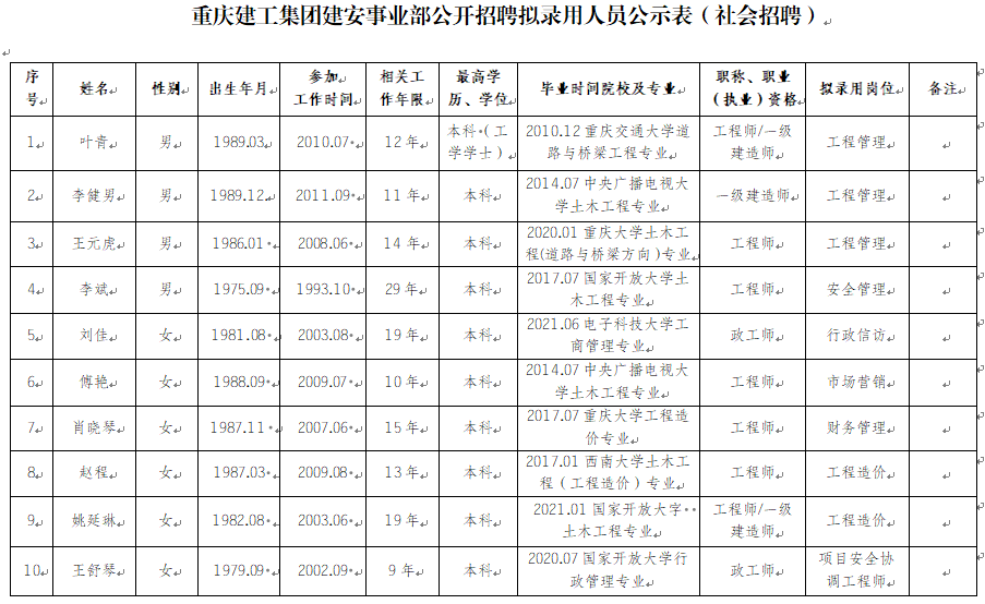 按照重庆建工集团员工招聘管理办法相关规定,根据重庆建工集团建安事业部招聘启事,经公开招聘,现将拟聘用人员予以公示。