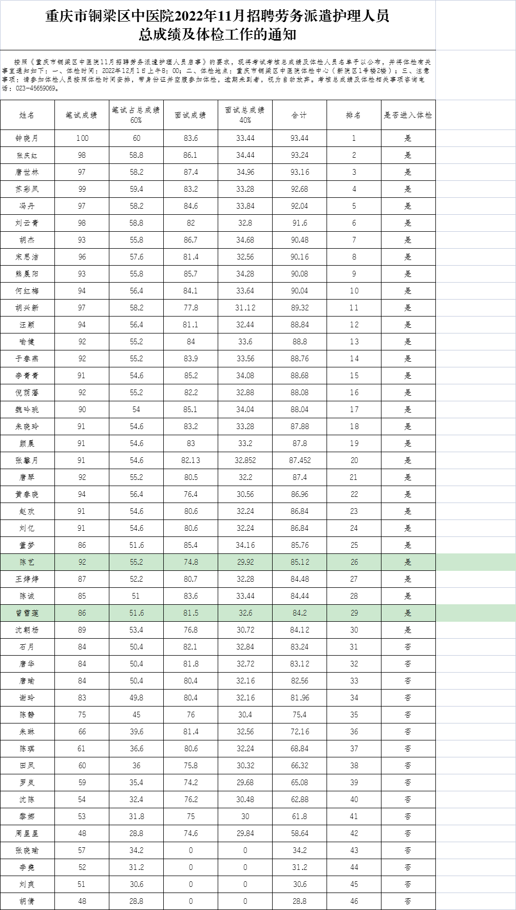 重庆市铜梁区中医院2022年11月招聘劳务派遣护理人员总成绩及体检工作的通知