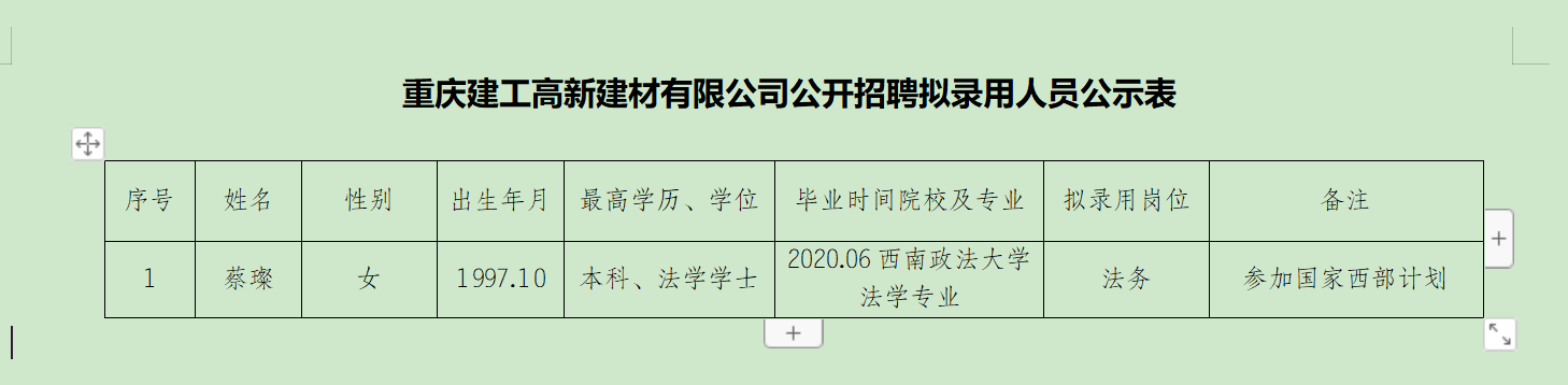 按照重庆建工集团员工招聘管理办法相关规定,根据高新建材公司招聘启事,经公开招聘,现将拟聘用人员予以公示。