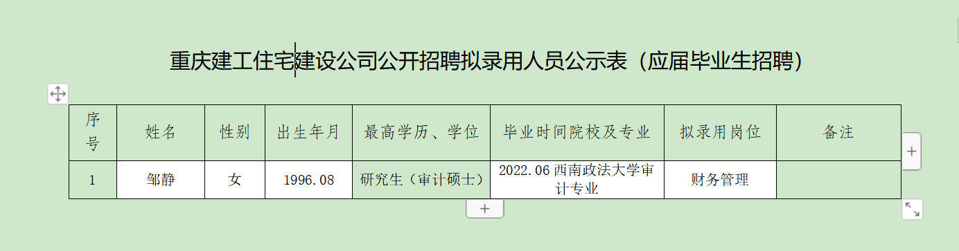 按照重庆建工集团员工招聘管理办法相关规定,根据重庆建工住宅建设有限公司招聘启事,经公开招聘,现将拟聘用人员予以公示。