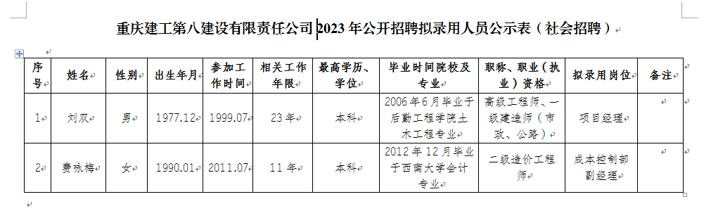 按照重庆建工集团员工招聘管理办法相关规定,根据重庆建工第八建设有限责任公司招聘启事,经公开招聘,现将拟聘用人员予以公示。
