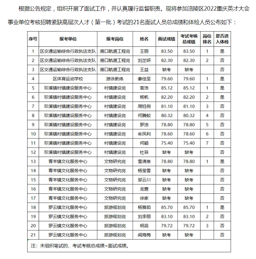 涪陵区2022重庆英才大会事业单位考核招聘紧缺高层次人才(第一批)总成绩和体检人员公布表