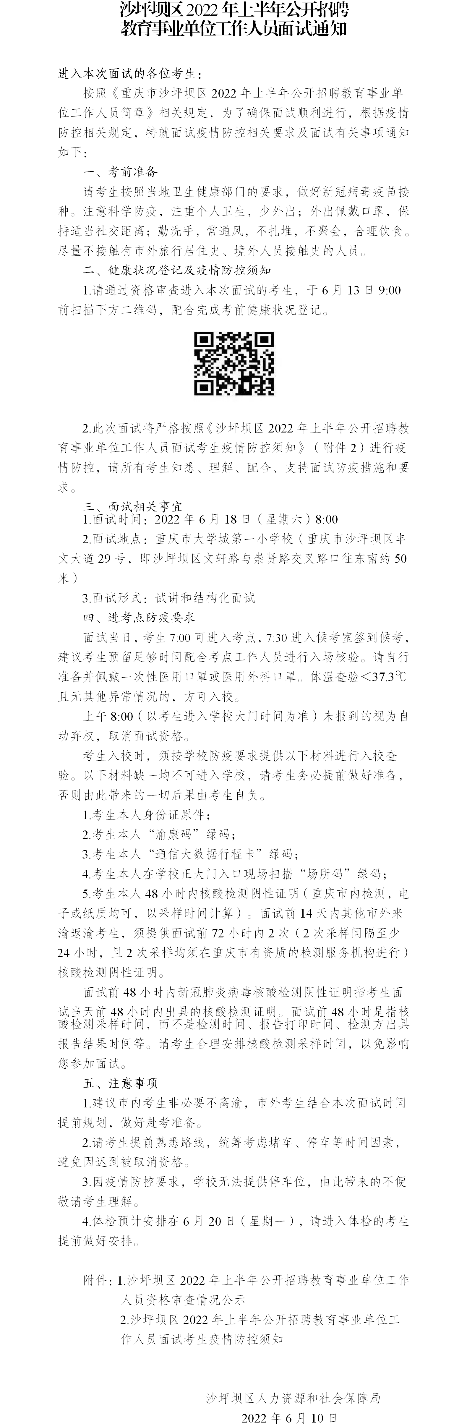 沙坪坝区2022年上半年公开招聘教育事业单位工作人员面试通知