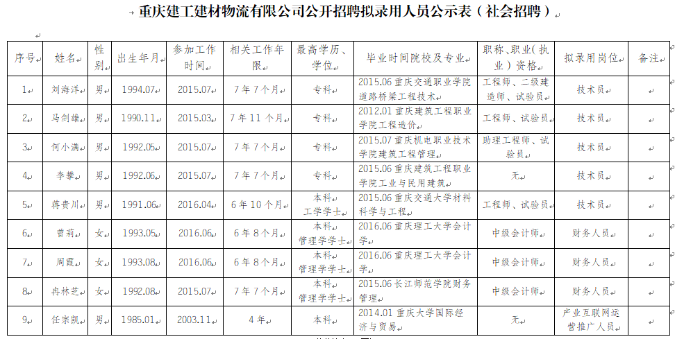 按照重庆建工集团员工招聘管理办法相关规定,根据重庆建工建材物流有限公司招聘启事,经公开招聘,现将拟聘用人员予以公示。