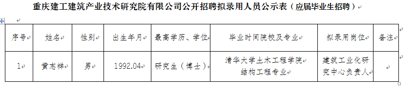 按照重庆建工集团员工招聘管理办法相关规定,根据重庆建工建筑产业技术研究院有限公司招聘启事,经公开招聘,现将拟聘用人员予以公示。