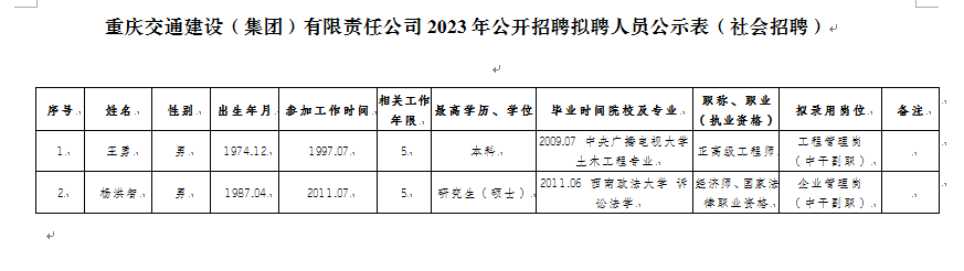 附件:重庆交通建设(集团)有限责任公司2023年公开招聘拟聘人员公示表