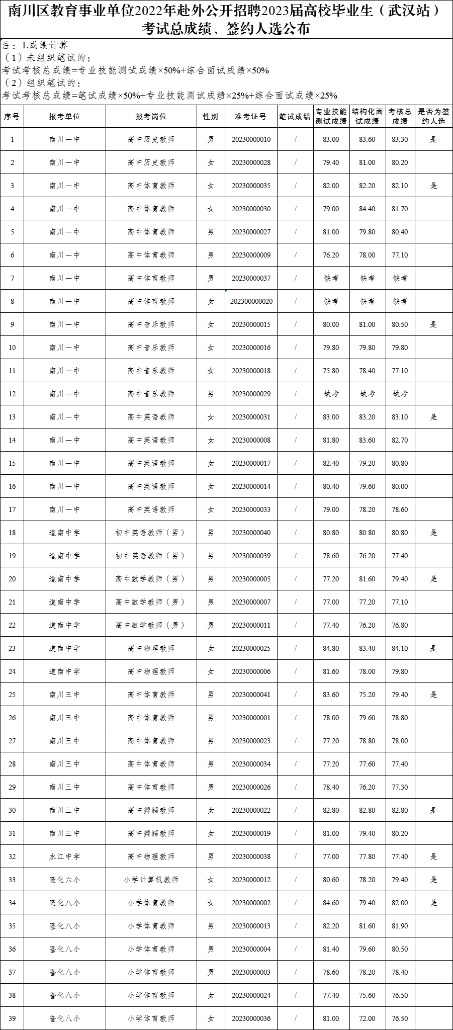 南川区教育事业单位2022年赴外公开招聘2023届高校毕业生(武汉站)考试总成绩、签约人选公布