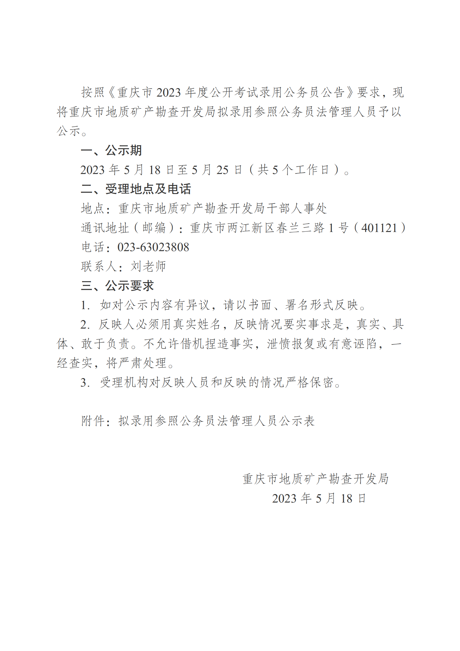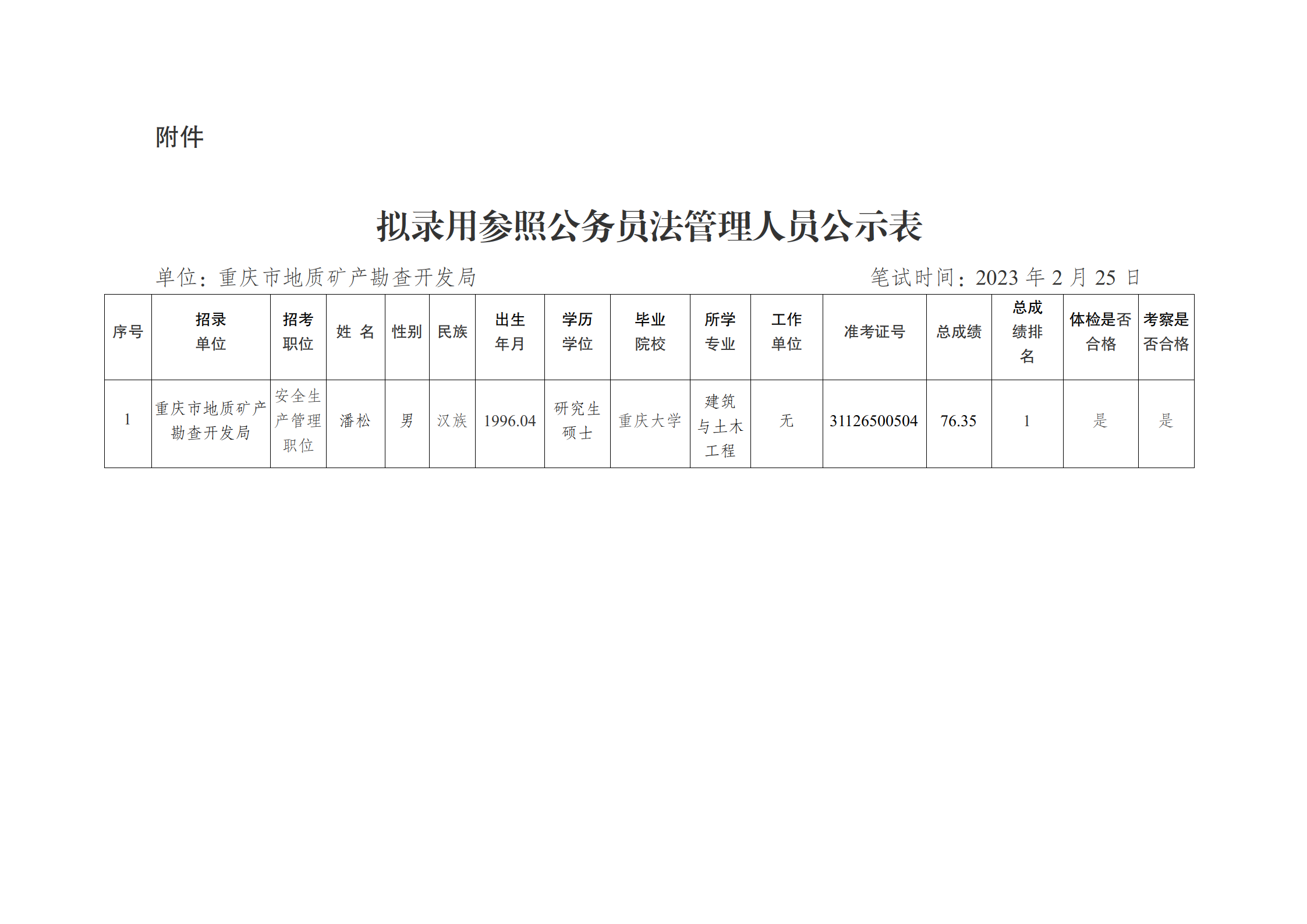 重庆市地质矿产勘查开发局2023年拟录用参照公务员法管理人员公示