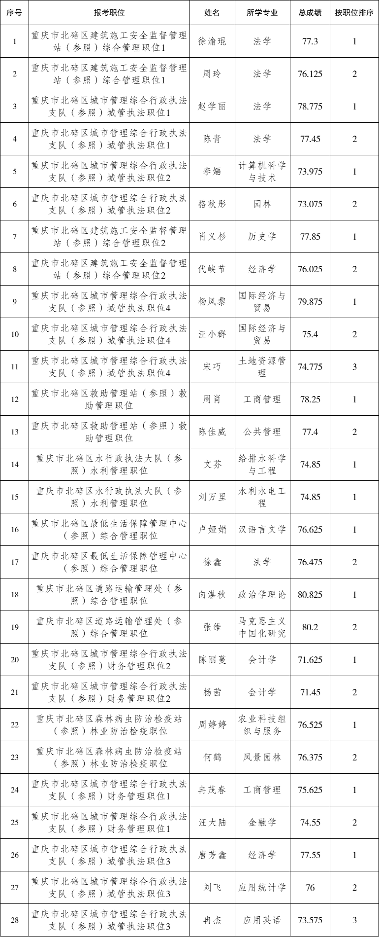 根据遴选公告规定,按考生的笔试和面试成绩各占总成绩的50%计算后,由高分到低分排序,现将各职位考察对象公布如下: