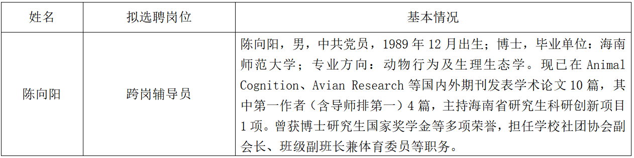 通过学院资格审查、课堂教学考核、学术评审以及辅导员考核等环节综合考评,结合学院教学科研岗及辅导员岗位的需求,经党政联席会审核研究,拟向学校推荐以下人员选聘到跨岗辅导员岗位,现将拟聘人员基本情况进行公示。