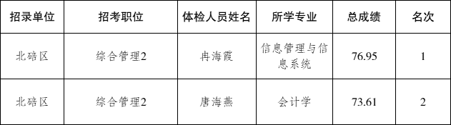 根据公告规定,按考生总成绩由高分到低分排序,现将2名进入体检的人员公布如下:
