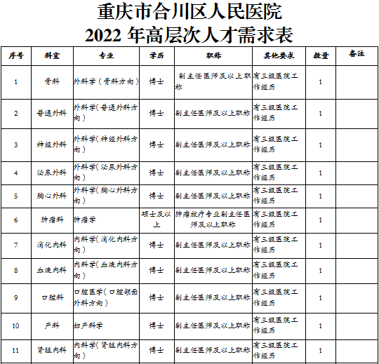 应聘人员请将个人简历电子件(邮件主题请注明:学科带头人+姓名+应聘职位)发送至电子邮箱:28924326@qq.com/hcrmyyrs@163.com或直接到重庆市合川区人民医院行政楼三楼人力资源科现场报名。个人简历请详细填写,应包含个人基本信息、学习及工作经历、主要工作业绩、技术能力、科研成果、获奖情况等内容。