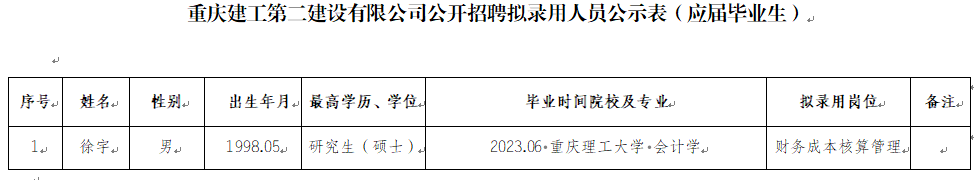 附件:重庆建工第二建设有限公司2023年公开招聘拟录用人员公示表