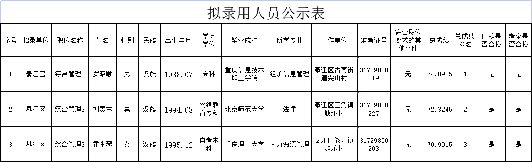 按照《重庆市2023年从优秀村(社区)干部中考试录用公务员公告》要求,现将拟录用公务员予以公示。