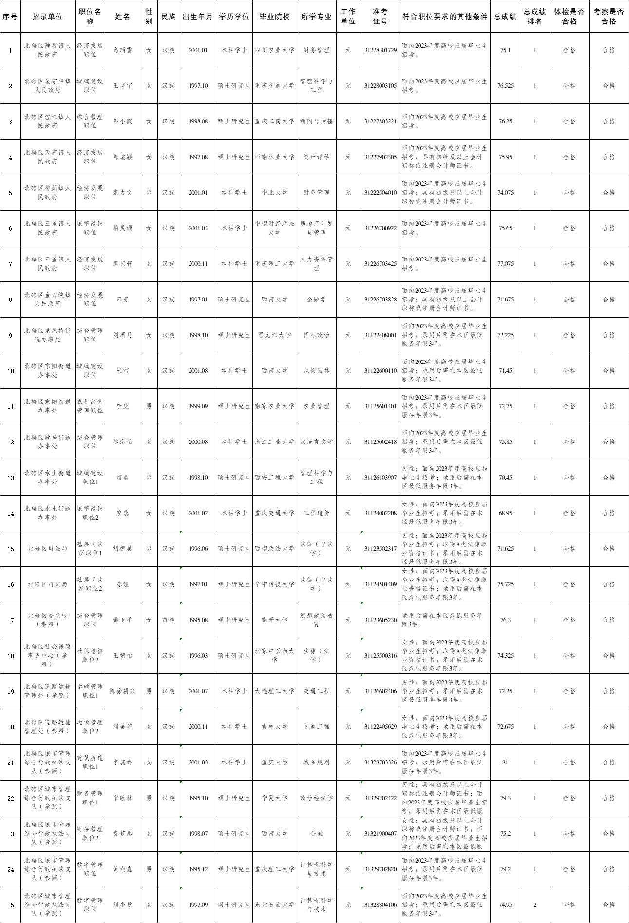 北碚区2023年度公开考试录用公务员拟录用人员公示表