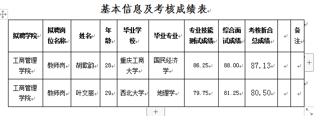 根据《事业单位人事管理条例》(国务院令第652号)、《重庆市事业单位公开招聘人员实施办法》(渝人发〔2006〕44号)和重庆市委组织部、市人力社保局《关于进一步规范事业单位公开招聘工作的通知》(渝人社发〔2011〕326号)及市人力社保局《关于印发<重庆市事业单位考核招聘工作人员办法>等6个公开招聘配套文件的通知》(渝人社发〔2016〕281号)要求,遵照《重庆科技学院2023年公开招聘事业编制专任教师简章》确定的招聘流程及考核程序,工商管理学院及教师工作部、教务处等职能部门联合对胡歆韵、叶文丽等2名博士进行了考核。现将其及基本信息及考核成绩予以公示。