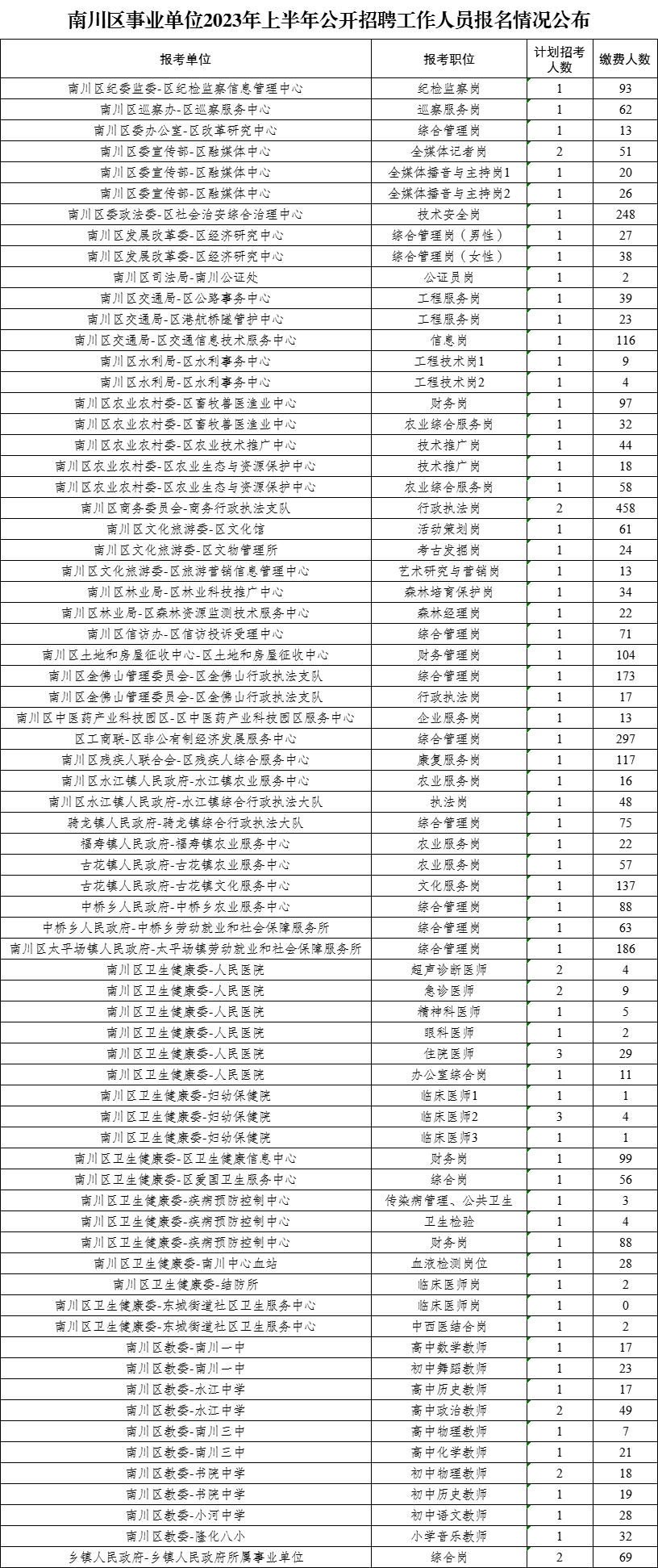 南川区事业单位2023年上半年公开招聘工作人员报名情况公布