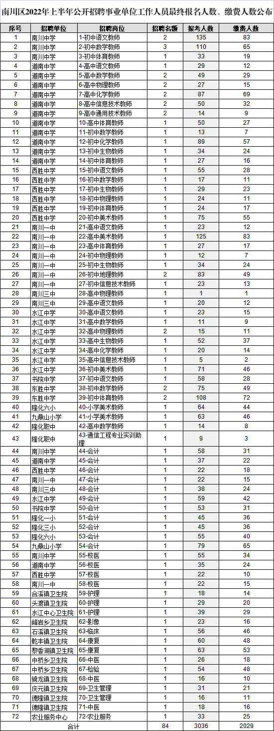南川区2022年上半年公开招聘事业单位工作人员最终报名人数、缴费人数公布
