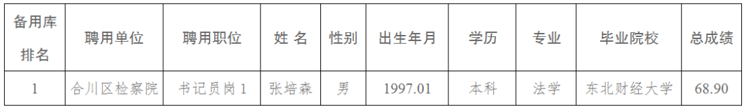 根据工作需要和缺额情况,按照《重庆市人民检察院第一分院及辖区检察院公开招聘聘用制书记员简章》中关于“建立备用人员库”的规定,我院拟从库中按考试总成绩从高到低的顺序,补充招聘1名“书记员岗1”聘用制书记员,现予以公示。经公示无异议或反映问题不影响聘用的,将按程序聘用为我院聘用制书记员。