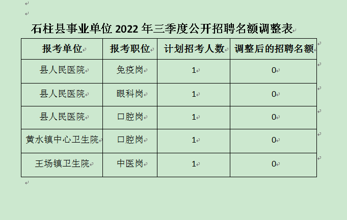 按照2022年7月1日发布的《石柱县事业单位2022年三季度公开招聘工作人员简章》中“未达到开考比例人员的处理”有关规定,根据本次招聘各岗位报名情况,岗位需求及人才紧缺程度,经报市级事业单位人事综合管理部门备案同意,现对有关岗位的招聘名额进行调整如下。