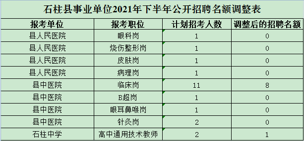 按照2021年12月20日发布的《重庆市石柱县事业单位2021年下半年公开招聘工作人员简章》中“未达到开考比例人员的处理”有关规定,根据本次招聘各岗位报名情况,岗位需求及人才紧缺程度,经报市级事业单位人事综合管理部门备案同意,现对有关岗位的招聘名额进行调整如下。