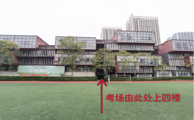 进入西门后,穿过足球场,进入综合楼(如下图所示)。