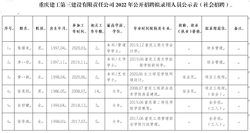 按照重庆建工集团员工招聘管理办法相关规定,根据重庆建工第三建设有限责任公司相关招聘启事,经公开招聘,现将拟聘用人员予以公示。