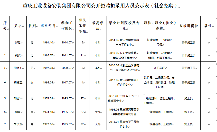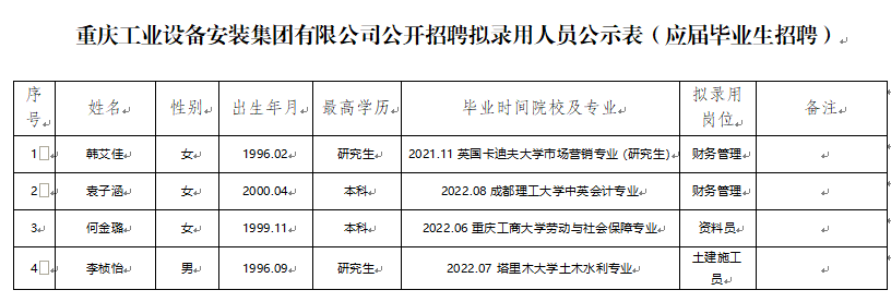 按照重庆建工集团员工招聘管理办法相关规定,根据重庆工业设备安装集团有限公司招聘启事,经公开招聘,现将拟聘用人员予以公示。