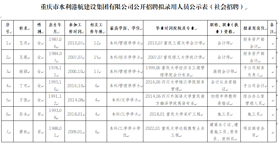 按照重庆建工集团员工招聘管理办法相关规定,根据重庆市水利港航建设集团有限公司招聘启事,经公开招聘,现将拟录用人员予以公示。