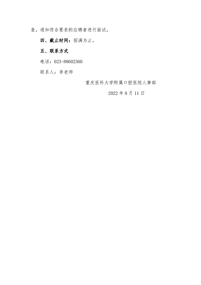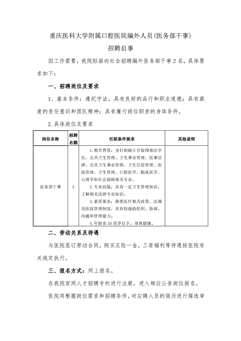 重庆医科大学附属口腔医院编外人员(医务部干事)招聘启事