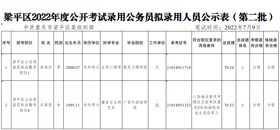 按照《重庆市2022年度公开考试录用公务员公告》要求,现将梁平区2022年度公开考试录用公务员第二批拟录用人员予以公示。