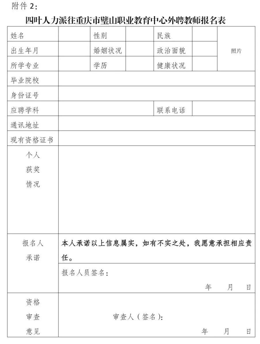 (1)填写《四叶人力派往重庆市璧山职业教育中心外聘教师报名表》一份(主页回复关键词登记表);