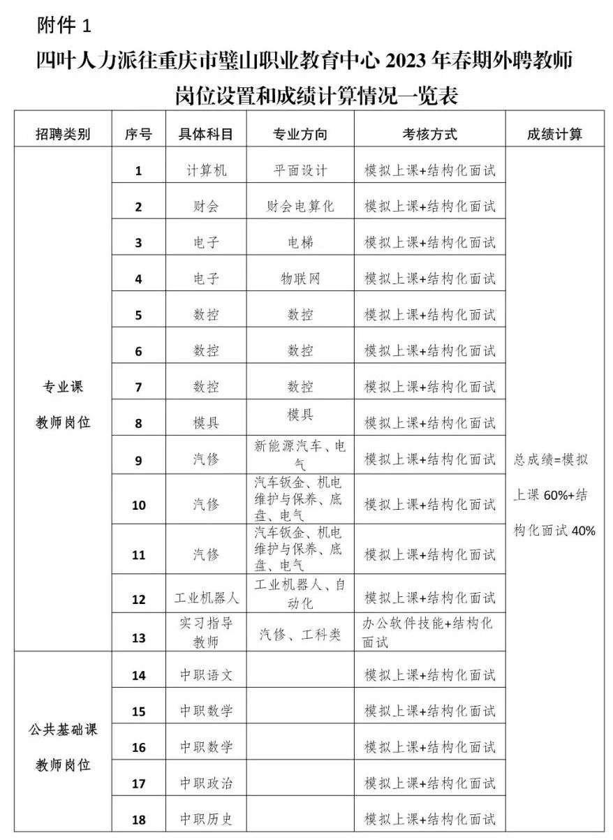 (二)各岗位考核方式和成绩计算详见附件1《四叶人力派往重庆市璧山职业教育中心2023年春期外聘教师岗位设置和成绩计算情况一览表》。