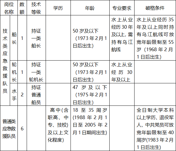 重庆市涪陵区水上应急救援专业队员共计招聘10名。其中:技术类应急救援队员4名,普通类应急救援队员6名。