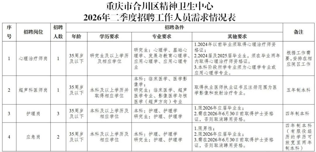 招聘的护理岗位需进行技能操作考试。考试时间:2026年5月7日下午14:00-16:00(如有变化电话通知),考试地点:合川区精神卫生中心(思居院区)。